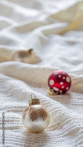 Fototapeta premium Winter holiday decorations on soft fabric surface with ornaments in focus, illuminated by gentle natural light