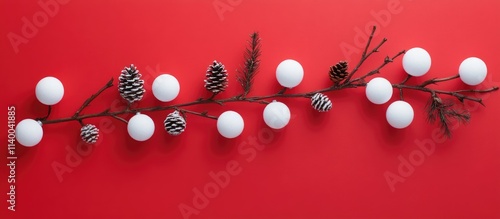 © NFTNexus, Fototapeta premium Winter holiday flat lay composition with fir cones and white ornaments on vibrant red background creating a festive atmosphere with copy space