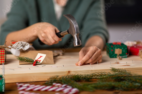 © Syda Productions, Obraz premium winter holidays and hobby concept - close up of woman with hammer hammering nails in wooden board and making advent calendar at home
