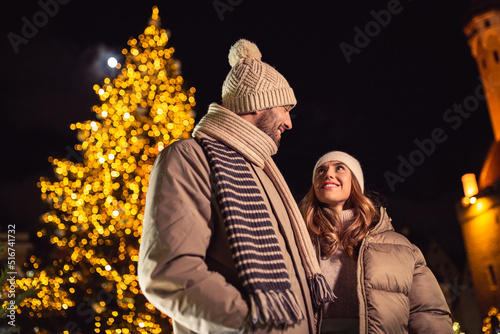 © Syda Productions, Naklejka premium winter holidays and people concept - happy smiling couple over christmas tree lights in evening city