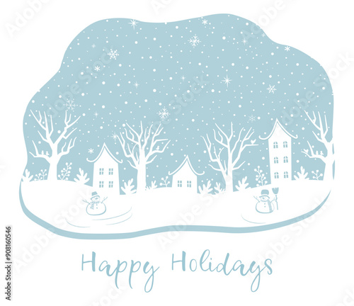 © irynaalex, Fototapeta premium Winter Holidays Greeting Card. Christmas Village. White Houses Silhouettes, Trees, Winter Plants, Berries, Snowmen, Birds. Snowfall. Snowflakes. Vector Illustration