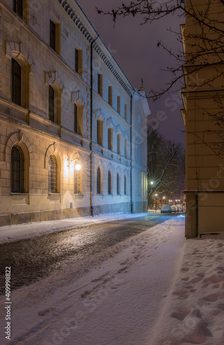 Fototapeta premium Winter in Krakow, Poselska street covered in snow, night, Poland