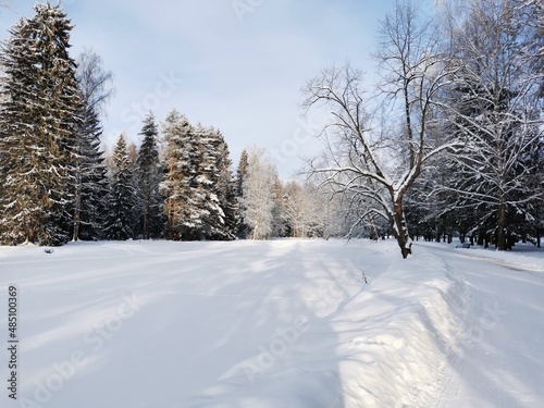 Fototapeta premium Winter in Pavlovsky Park white snow and cold trees