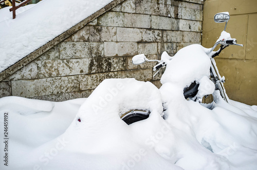 © koldunova, Fototapeta premium Winter in Russia. Motorcycle parked near the wall of the house is almost completely covered with snow and waiting for spring, and the beginning of the season for long journeys.