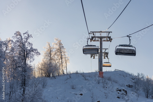 Fototapeta premium Winter in the mountains. Ski resort. Chair lift. White trees. Snow trees.
