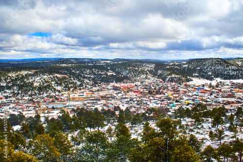 © Alex Borderline, Fototapeta premium winter in village surrounded by mountains, snow covered the forest and hills, creel chihuahua