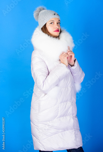 Obraz premium Winter is in the air. woman in padded warm coat. beauty in winter clothing. cold season shopping. girl in beanie. faux fur fashion. flu and cold. seasonal fashion. happy winter holidays. christmas