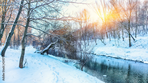 © pilat666, Obraz premium Winter landscape by a river in the sunset