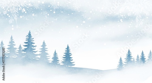 © vadosloginov, Naklejka premium Winter landscape featuring snow-covered trees and gentle snowfall in a serene outdoor setting