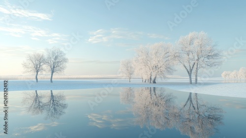 © bade, Fototapeta premium Winter landscape frost-covered trees reflected in calm lake