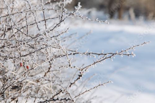 © anatoliycherkas, Obraz premium Winter landscape. Frozen berries of red briar