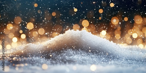 © KenPix, Obraz premium Winter landscape, glowing golden bokeh lights, snow mounds, starry night sky, magical atmosphere, macro photography, depth of field, warm and cold contrast, ethereal, dreamy scene, sparkling snowflake