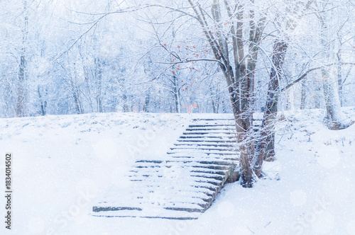 Fototapeta premium Winter landscape in cold tones - winter frosty trees and ancient stone stairs...