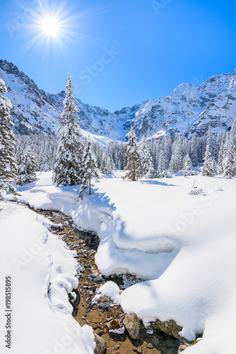 Obraz premium Winter landscape in valley near Morskie Oko lake, Tatra Mountains, Poland