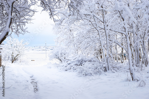 © Natalia, Fototapeta premium Winter landscape. Leaning trees covered with snow in a winter forest in the countryside