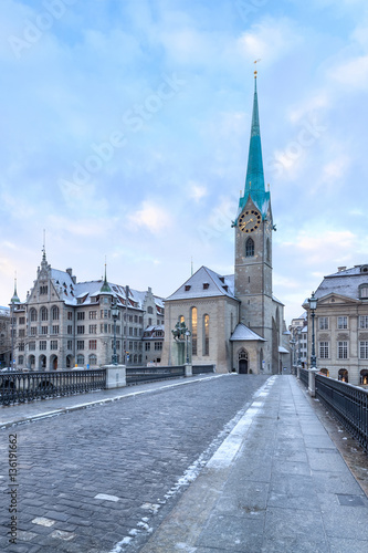 Naklejka premium Winter landscape of Zurich. Waldmann monument and Munsterbrucke bridge, Switzerland