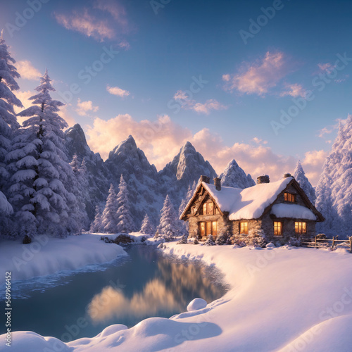 © Marcus, Fototapeta premium winter landscape scene a small lodge and peaceful river, generative art