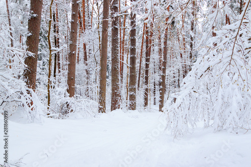 Fototapeta premium Winter landscape, ski track through fairy pine forest covered by fresh white...