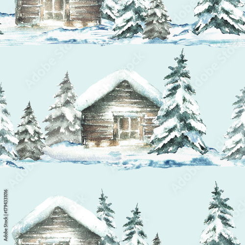 © Bartol_art, Fototapeta premium Winter landscape snow covered cabin with snowy spruce tree watercolor seamless pattern. Wooden house and Christmas fir realistic hand drawn illustration Fabric on isolated light blue green background