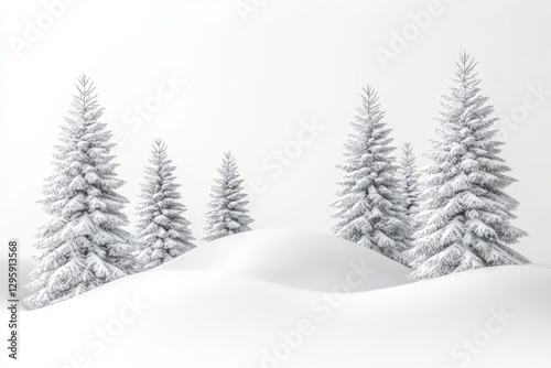 Naklejka premium Winter landscape, snow-covered pine trees, white forest, serene scenery, minimalist design
