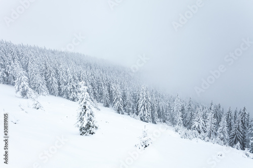 Naklejka premium Winter landscape snowy forest, mist starting to rise from the valley