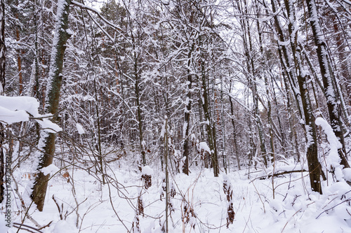 Fototapeta premium Winter landscape. Snowy trees, frost, big snowdrifts and snowfall.