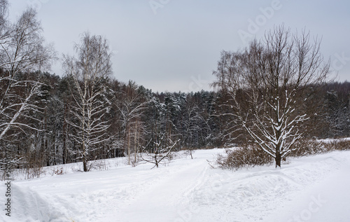 Fototapeta premium Winter landscape. Trees on a snow-covered field.