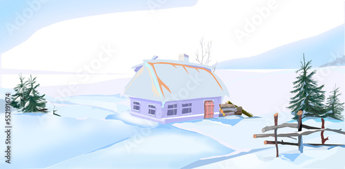 Fototapeta premium Winter landscape with a house and firs in blue tones. Winter cartoon.