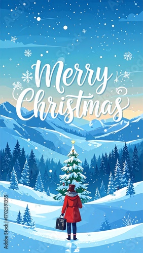 Naklejka premium Winter landscape with Christmas tree and traveler