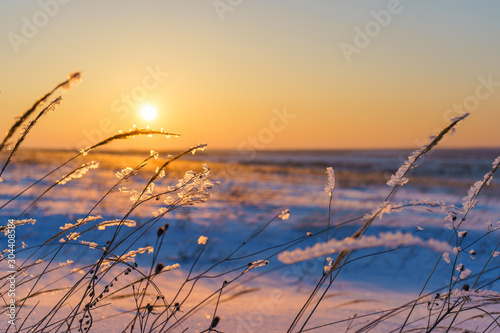 © Tatyana_Andreyeva, Fototapeta premium Winter landscape with dry frozen grass on the background of snow covered plain, blue sky and orange sun at sunset. Beautiful natural scenery. Selective focus