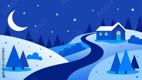 © sumona, Fototapeta premium Winter landscape with house and crescent moon