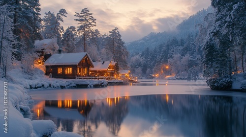 © Nadya, Fototapeta premium winter landscape with house by the river