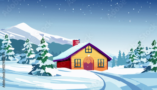 © Waseem, Naklejka premium Winter landscape with house in the mountains. Vector illustration.
