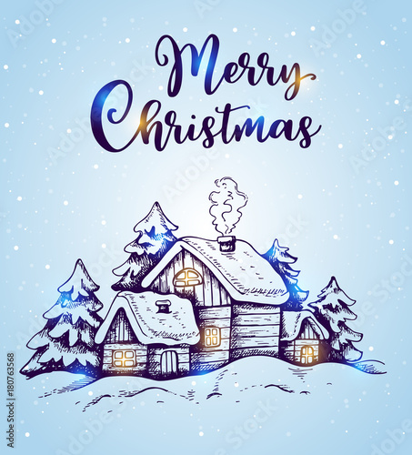 Naklejka premium Winter landscape with houses and fir trees
