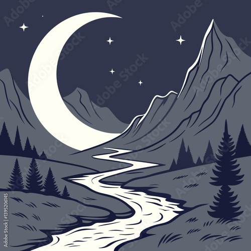 Fototapeta premium Winter Landscape With Mountains Melting Crescent Moon Over Mountain Valley – Glowing Silver Rivers Fantasy Landscape Vector
