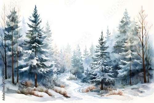 © Olena, Fototapeta premium Winter landscape with pine trees in watercolor style. Snow-covered spruce forest