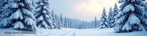 Naklejka premium Winter landscape with snow-covered pine trees, snow fall, winter forest