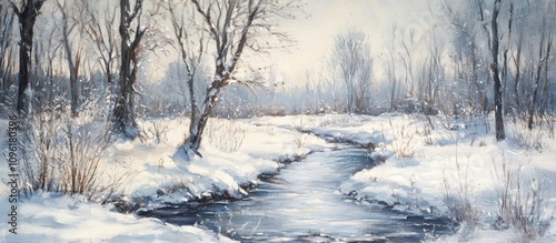 Fototapeta premium Winter landscape with snow covered stream and bare trees reflecting a serene and tranquil atmosphere in a peaceful natural setting