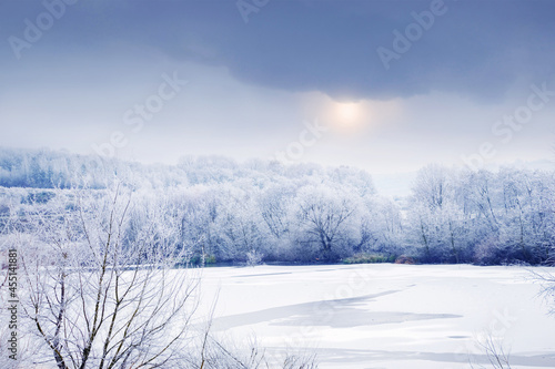 © Volodymyr, Fototapeta premium Winter landscape with snow-covered trees by the river and the sky with dense clouds through which the sun shines