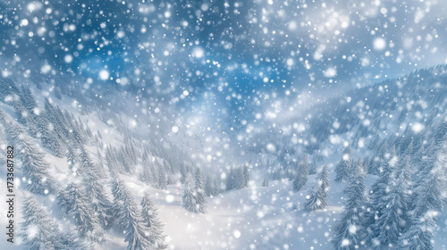 Obraz premium Winter landscape with soft snowflakes falling amidst evergreen trees under a...