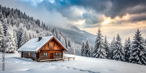 © Sanook, Naklejka premium Winter landscape with wooden house in a mountain forest Cloudy day and fresh snow Generative By AI