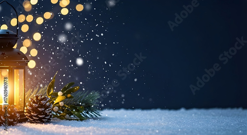 Naklejka premium Winter lantern glowing in the snow with pine cones and Christmas greenery.