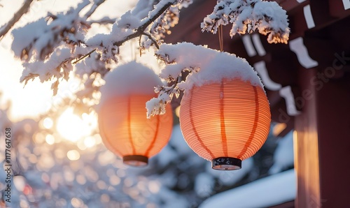 Obraz premium Winter Lanterns, snow-laden lanterns dangle from branches, creating a serene...