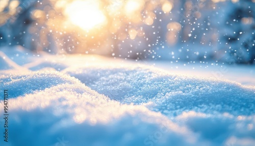 © Nawarit, Naklejka premium Winter light over the frozen landscape, with soft light illuminating the snow-covered ground, creating a serene winter scene, Serene, Cool Tones, Wide Angle