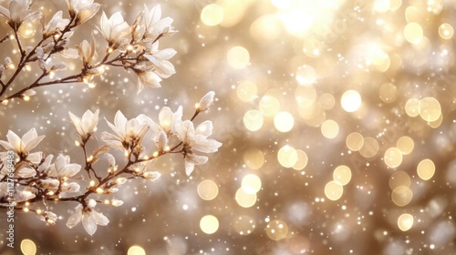 © Sam-th, Fototapeta premium Winter Magnolia Blossoms with Golden Lights and Snow