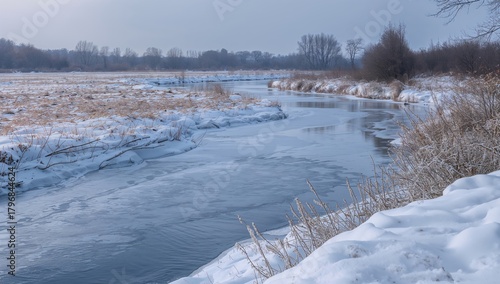 © NeuralNiche, Obraz premium Winter marshland landscape featuring snow-covered terrain, seasonal change