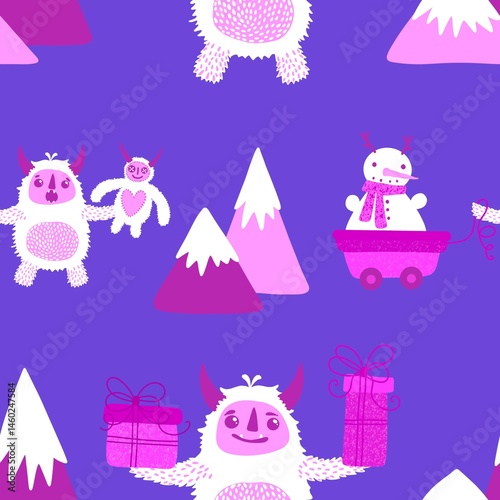 © Tetiana, Fototapeta premium Winter monsters seamless Christmas yeti pattern for wrapping paper and fabrics