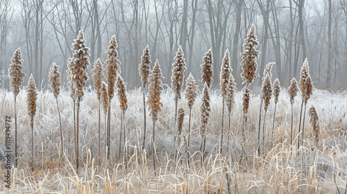 Fototapeta premium Winter morning in the woods. Frost-covered plants in the forest at sunrise