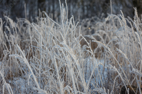© Dainis, Fototapeta premium Winter morning, snowy surroundings, cold, frosty. snow covered all the grass everything around shines.