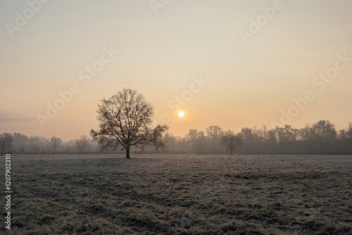 © davidepalli, Fototapeta premium Winter morning. Winter morning at sunrise and frost on the grass.
